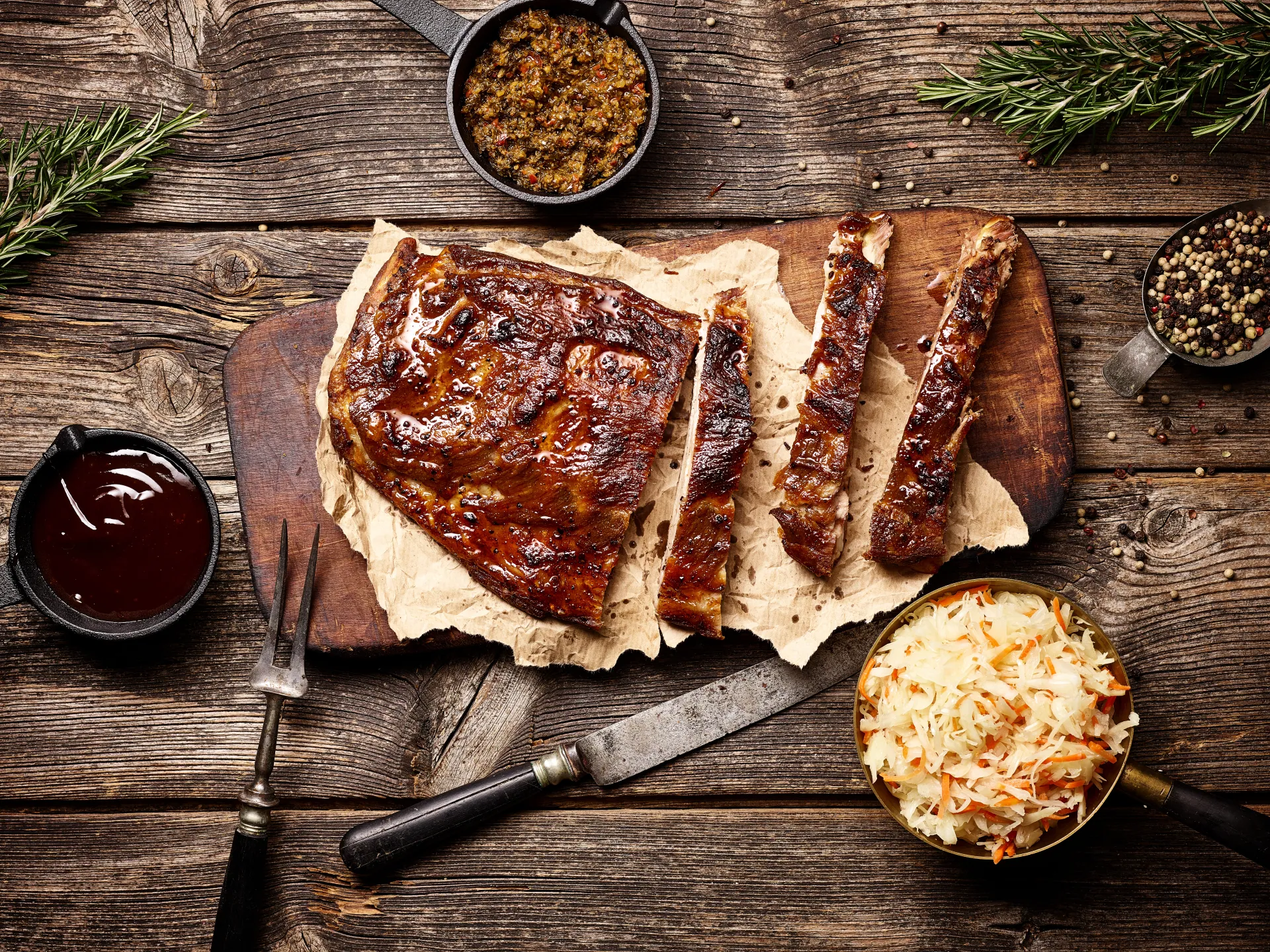 2 Spanferkelkeulen, 50 g Kräuter der Provence, 1 Teelöffel Senf, 1 Knoblauchzehe, gehackt, 100 ml Olivenöl, Salz, Pfeffer, 20 g Zucker, 2 Esslöffel Balsamico