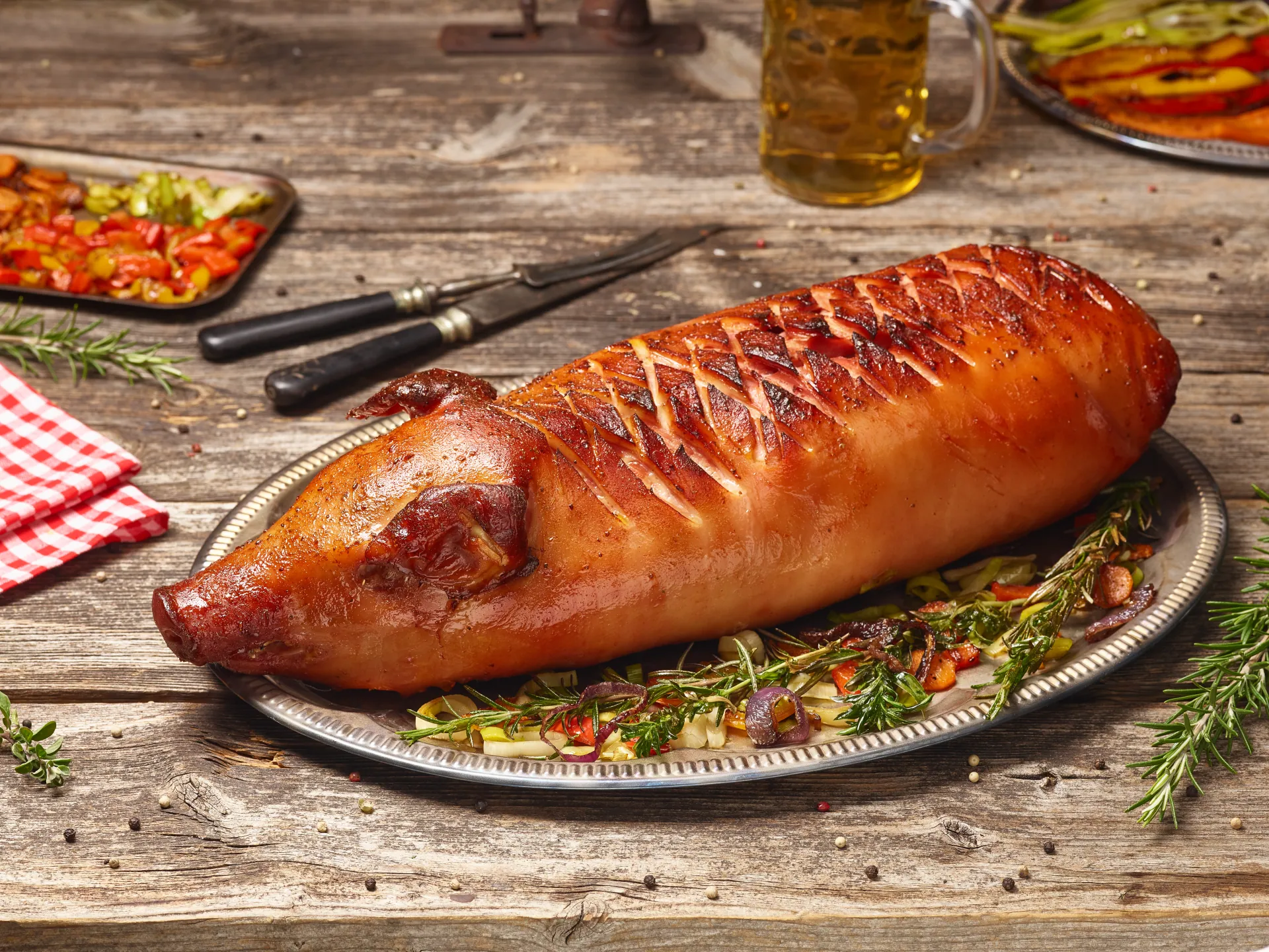 Spanferkelkeule ca 1 Std. bei mittlerer Hitze im Backofen garen.